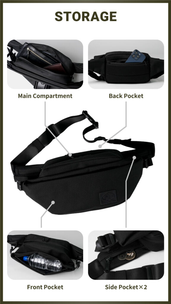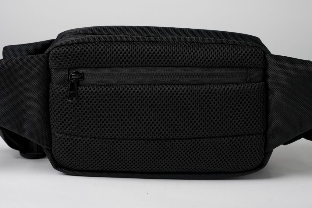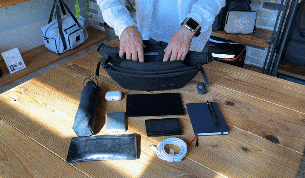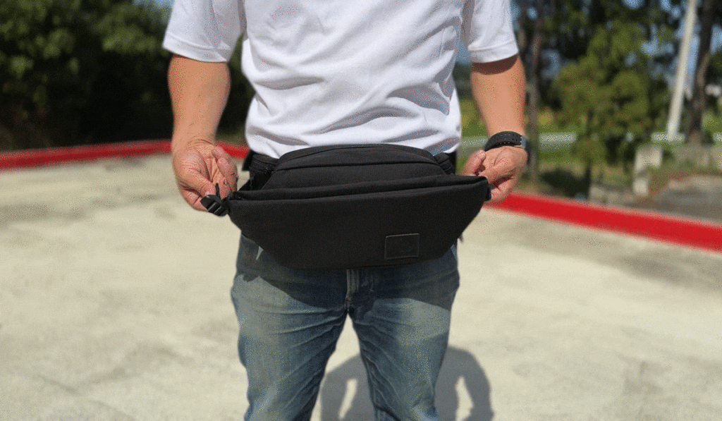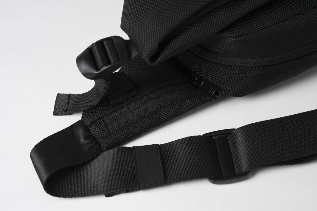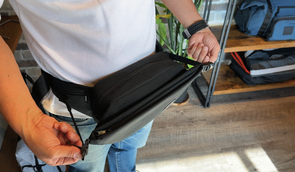 拡張式のフロントポケットは一瞬でベルト調節ができるので、必要に応じたサイズに即座に変えられます。