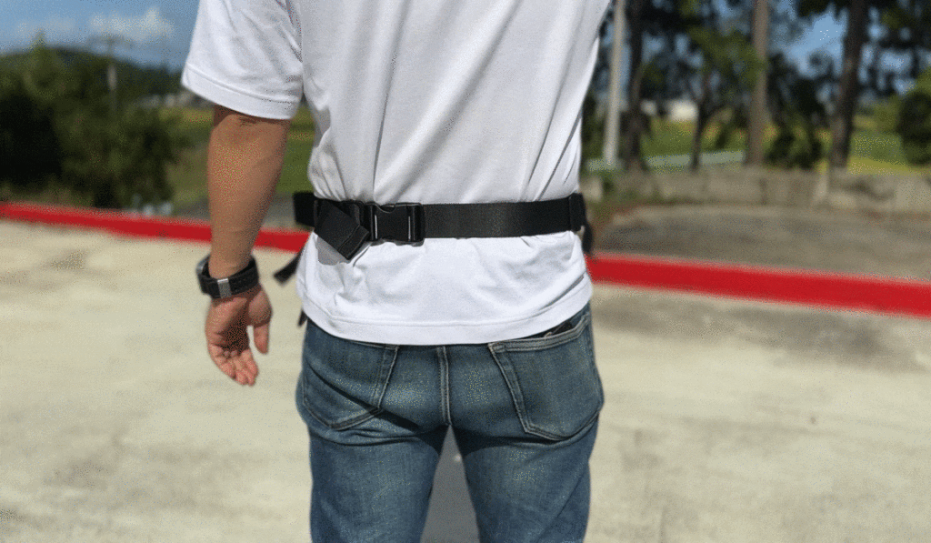 両サイドのアジャスターベルトを引っ張ることで体に密着し、負担を軽減します。