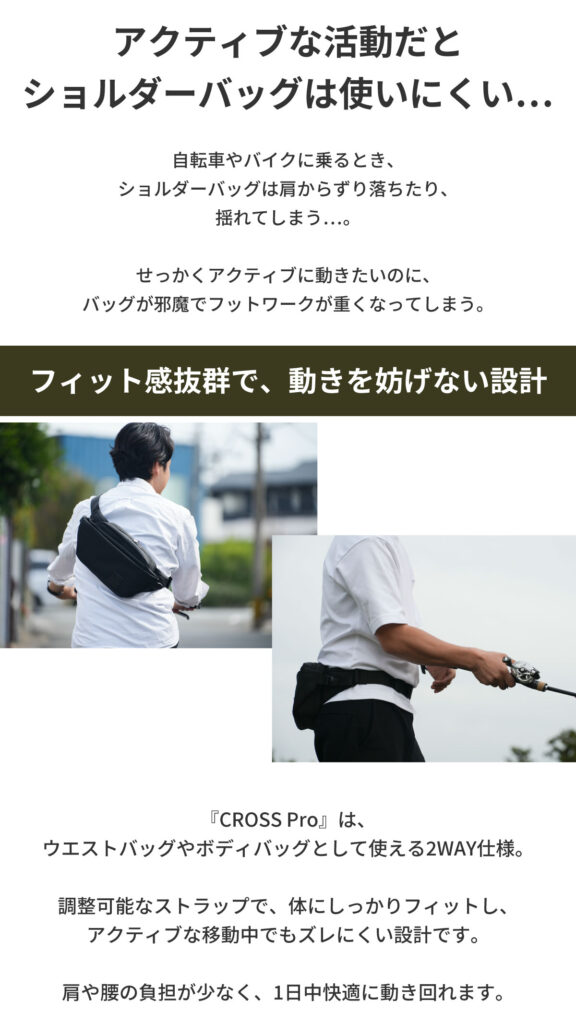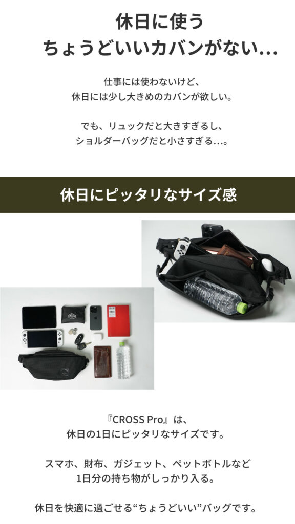 『CROSS Pro』は、家族とのお出かけや趣味の時間、アウトドアまで、1日のアクティビティをすべてカバーするバッグです。