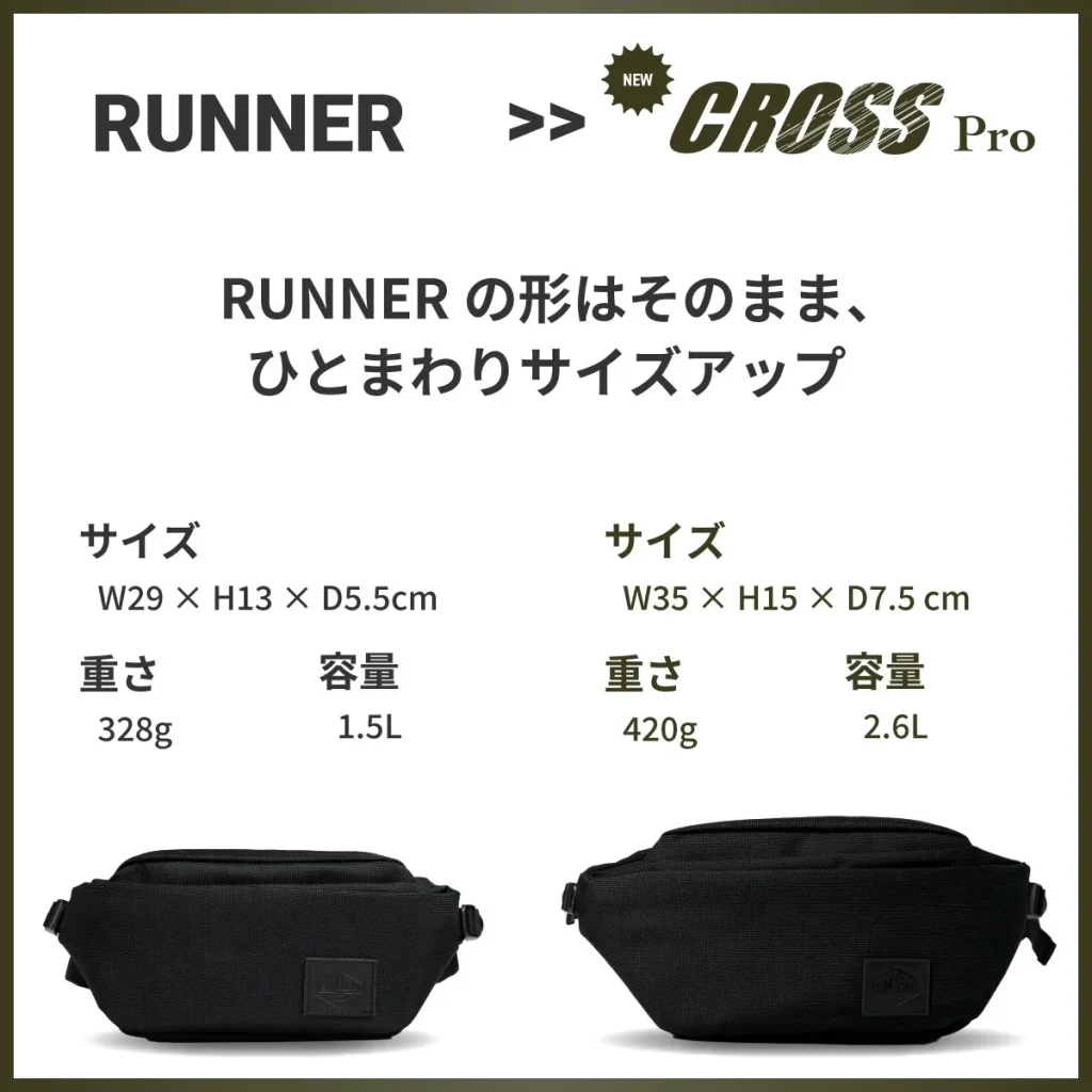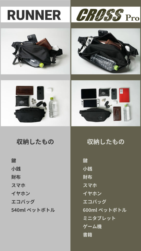 『RUNNER』はちょっとしたお出かけに、『CROSS Pro』は1日のお出かけに必要な荷物を収納できます。