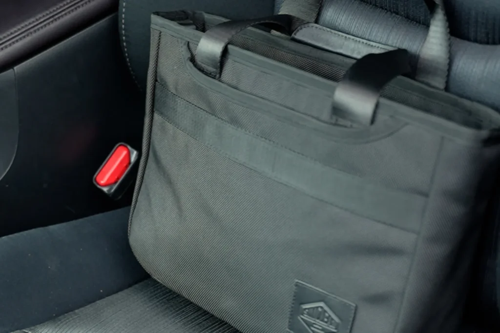 助手席にポンと置けて、乗り降りがスムーズなじゃまにならないサイズ感のバッグ。